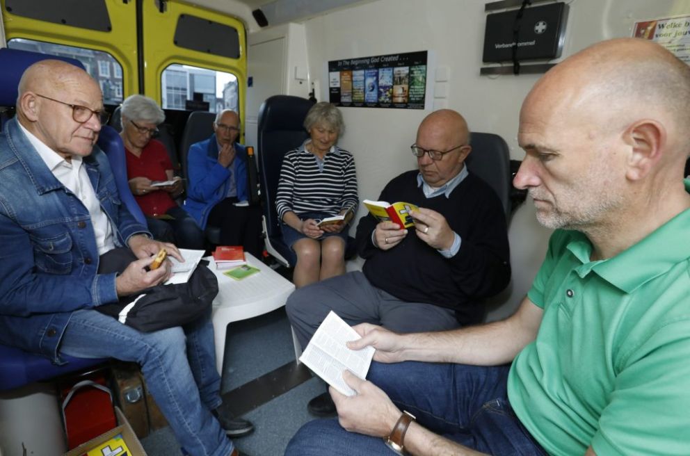 Vrijwilligers van Sjofar komen voorafgaand aan de evangelisatieactie in de bus bij elkaar om te bidden en de Bijbel te lezen.