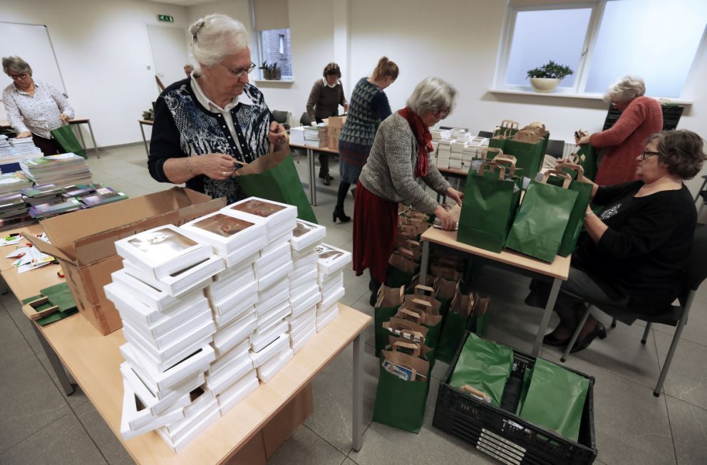 Foto's: VidiPhoto. Leden van vrouwenverenigingen van Betuwse kerken pakken honderden kerstpakketten in voor Poolse en Roemeense arbeidsmigranten in de Betuwe.